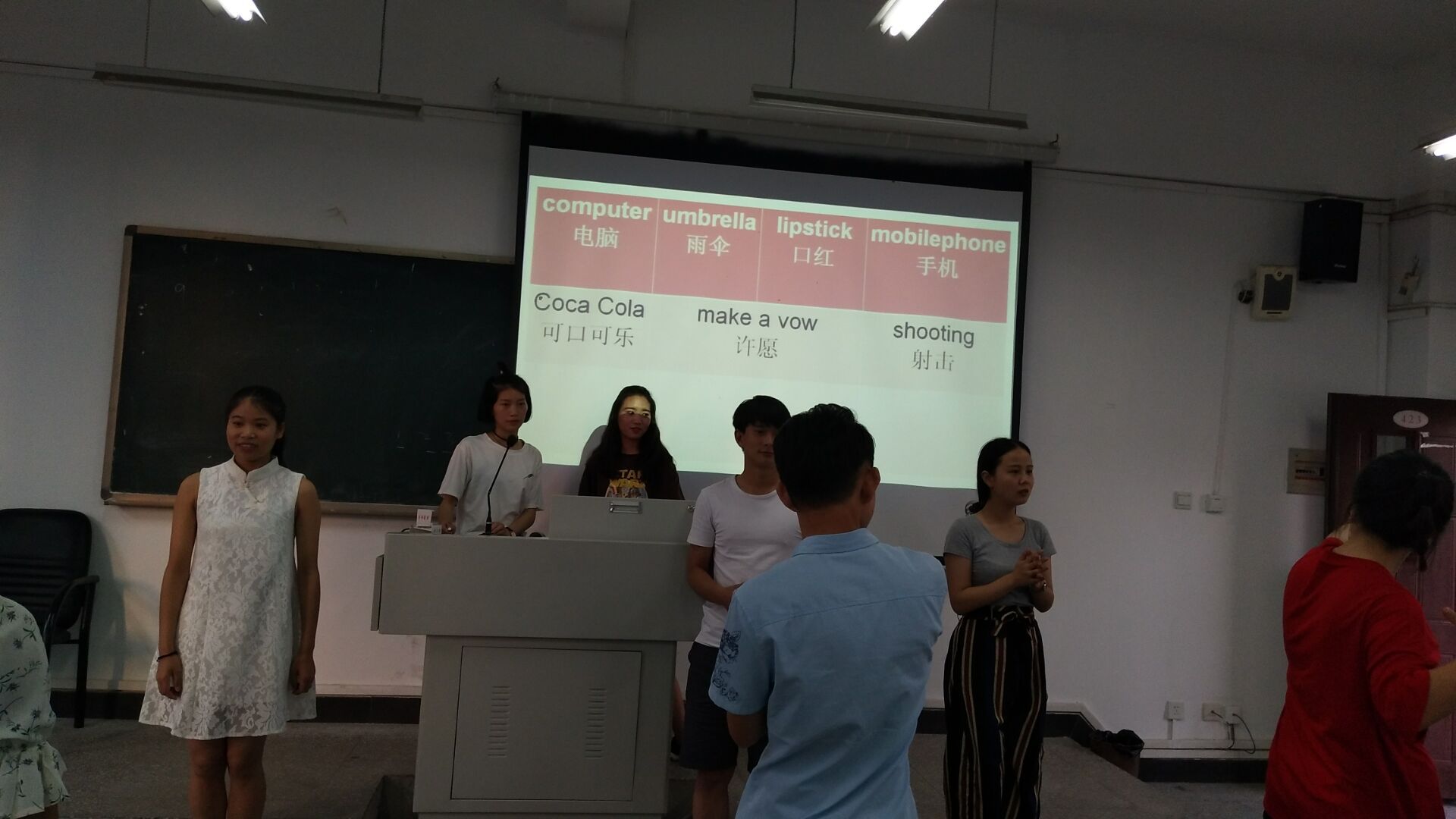 本次活动分为三个环节。一是畅谈职业梦想。同学们踊跃发言,有用全英文,也有用中英文结合表达他们的教师、主持人、财务经理、导游等梦想。二是看动作猜单词。两个同学一组,面向屏幕的同学用英语结合身体语言描述屏幕上的图片,背对屏幕的同学则猜出相应的英语单词。此环节的参与度高,气氛活跃。三是看图片说话。同学们尝试着用英语描述图片并揭示其中深意。