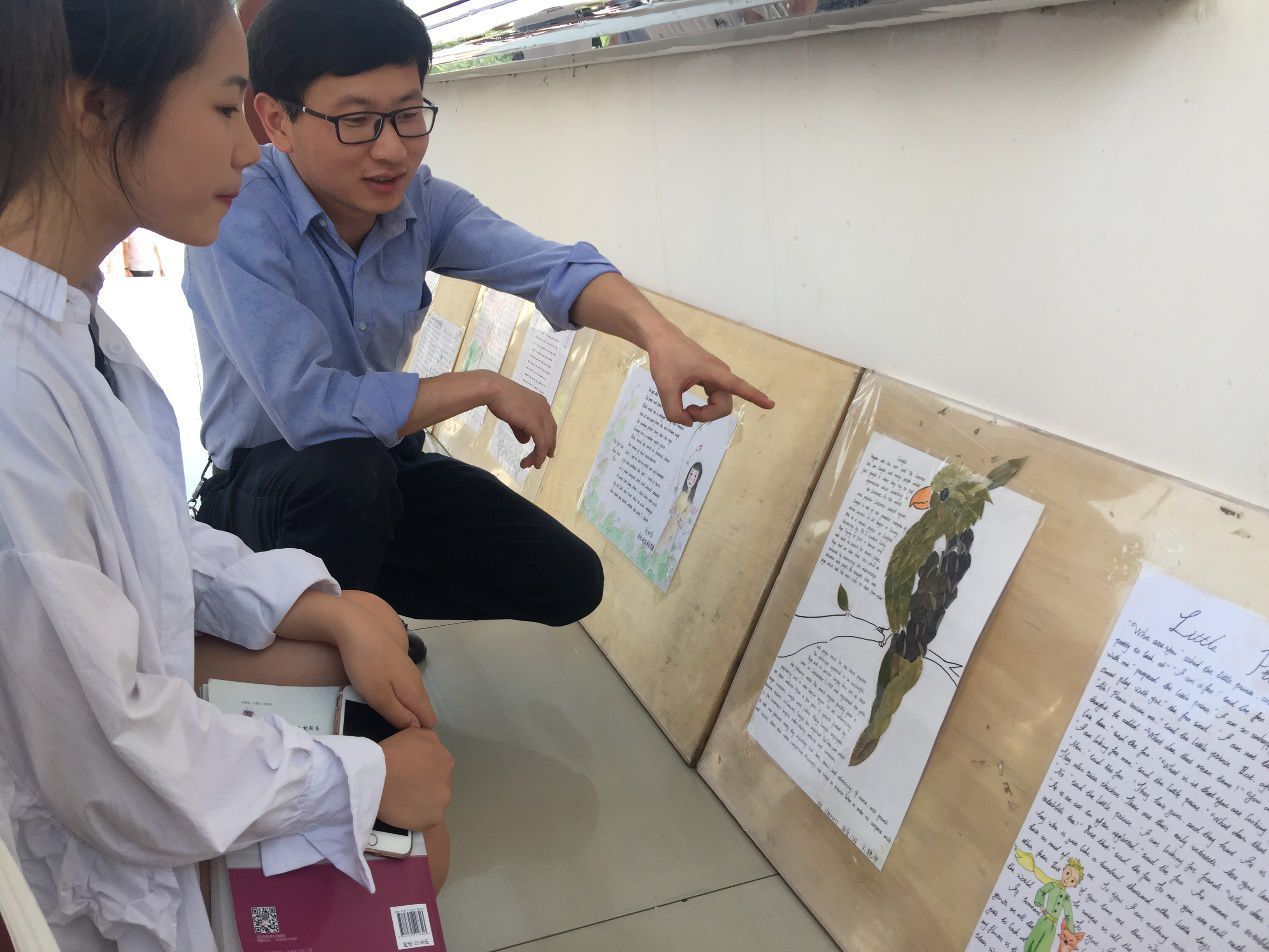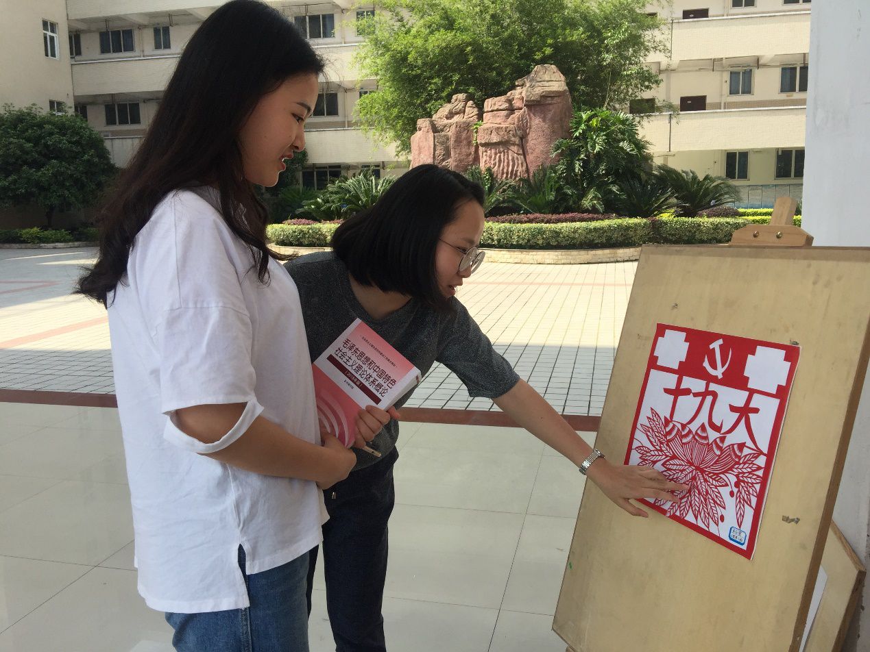 在作品展示环节,部门同志以富有吸引力的话语表达积极向同学们介绍作品寓意及意义,使得作品深受同学们喜爱。其中,周欢老师向同学介绍了一幅党徽照耀下“十九大”字样在万花丛中显现的剪纸作品,彰显了党的事业在“十九大”精神指导下必将蓬勃发展。孔新万老师向同学介绍了一幅“小王子”文章节选的英语书法作品,通过错落有致的行文布局、粗细有别的文字符号、辅以形象生动的漫画人物,深深吸引了员工的注意力而沉浸在优美的文字魅力中。