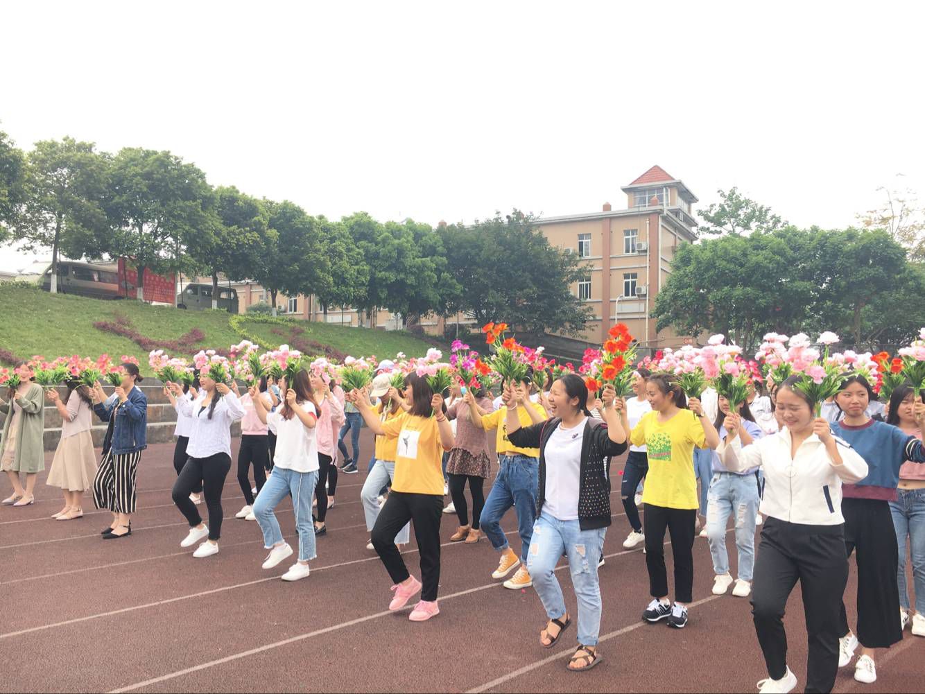 411日,在操场上鲜花队和啦啦操队正在为了第十一届运动会积极训练,她们充满激情,绚丽的花束洋溢着青春的活力,动感的音乐振奋人心。