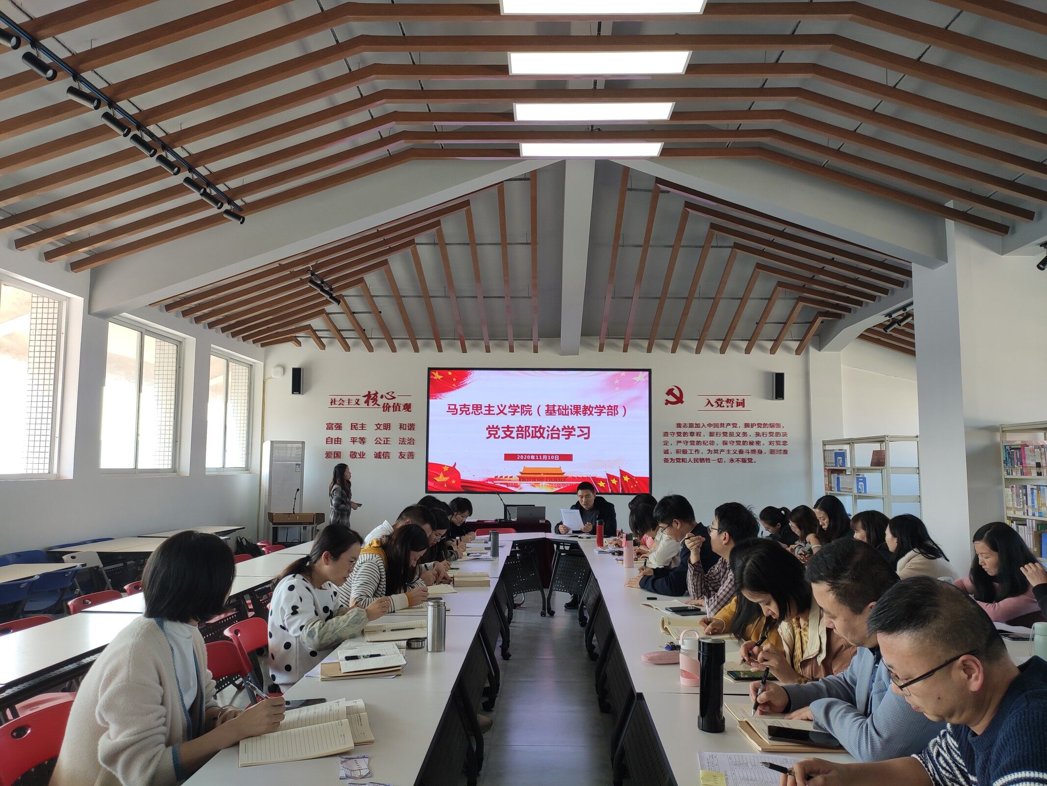 2020年11月10日下午,马克思主义公司(基础课教学部)党支部全体党员在文华楼7楼思政教育馆开展集中政治学习,学习活动由党支部副书记陈浩同志主持。